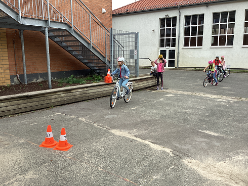 Die Radfahrausbildung im 4. Schuljahr besteht aus einem theoretischen Teil in der Schule und einer praktischen Prüfung, die meist von einem Polizeibeamten mit Unterstützung von Elternteilen betreut wird. Zurzeit sind die 4. Klassen fleißig auf dem Schulhof am Üben: Links abbiegen, Hindernis umfahren, das richtige Aufsteigen an der Straße usw.